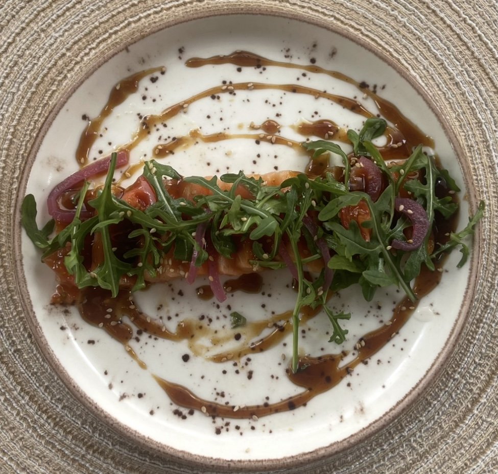 Tiradito de Salmon con aguacate, naranja y teriyaki