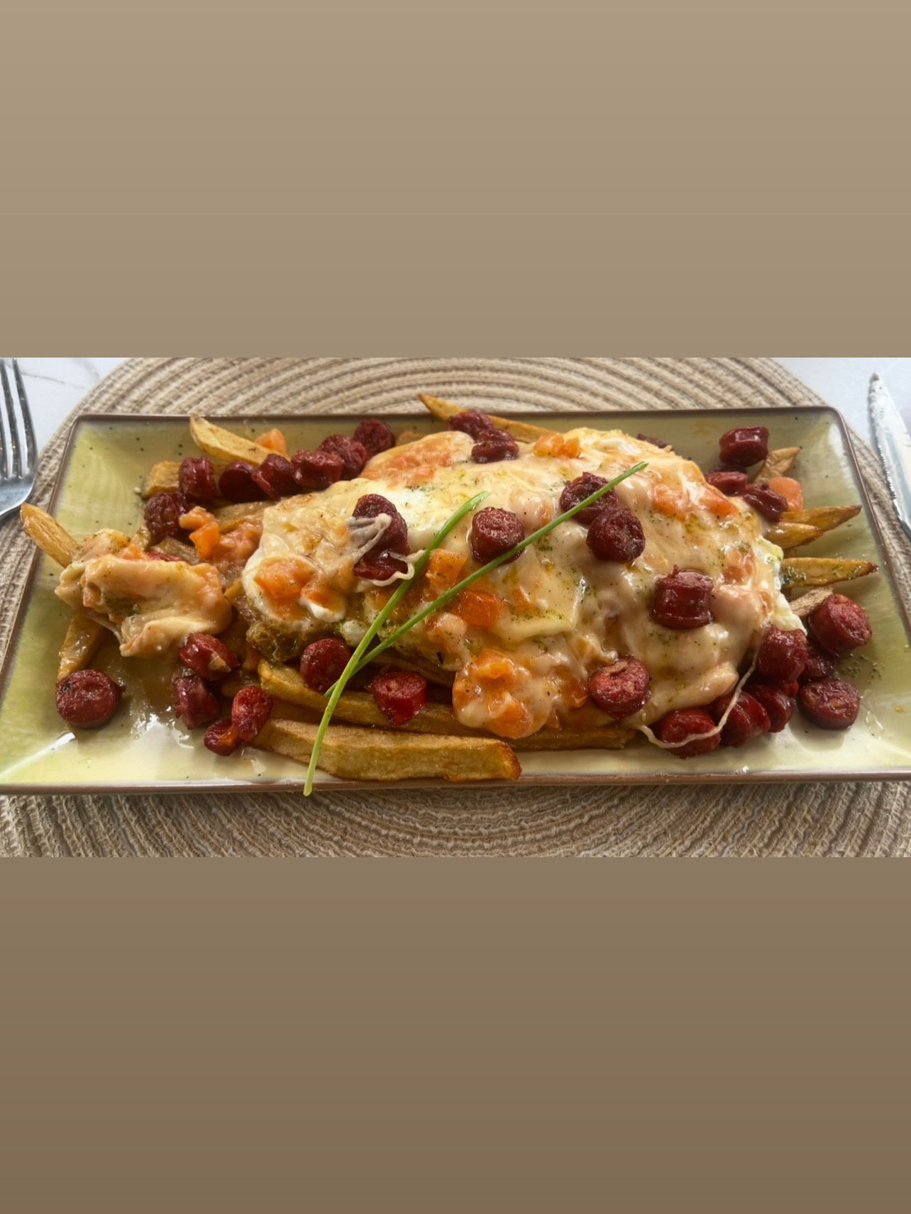 Huevos rotos con chistorra y provolone