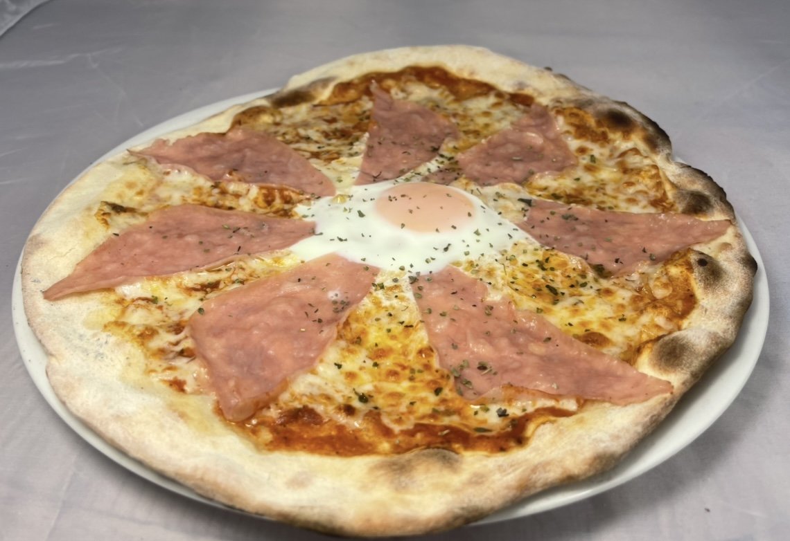 Salsa de tomate, queso mozzarella, jamón york y huevo frito.